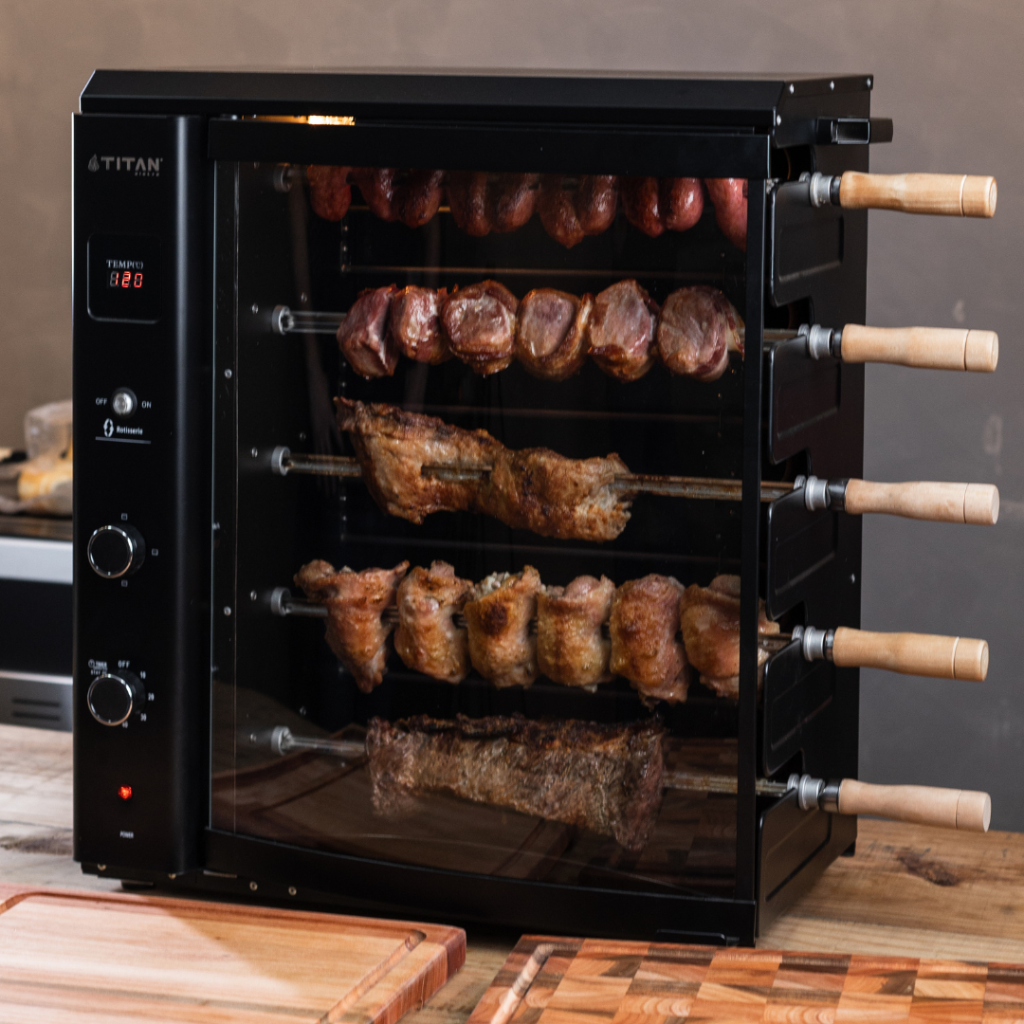 Churrasqueira elétrica com espetos giratórios para bancada ou mesa de suporte. É ideal para assar Carnes, Peixes, Legumes e frutos do mar. Possui sistema rotativo de espetos até 8,5kg de peso (ex.carnes). Churrasqueira silenciosa e não produz fumo.